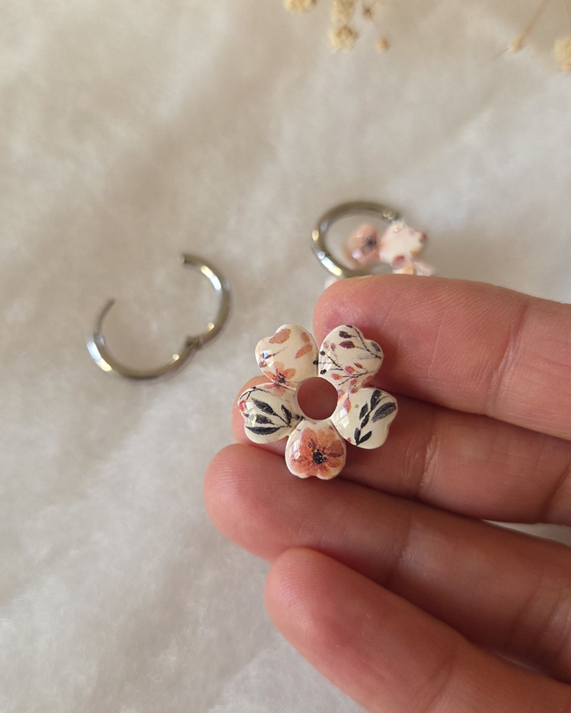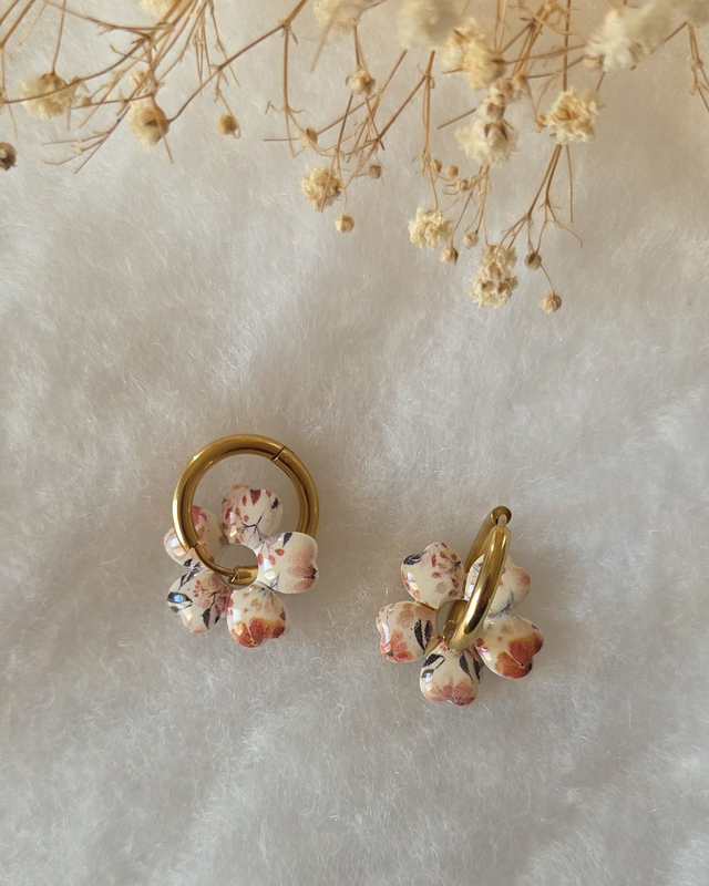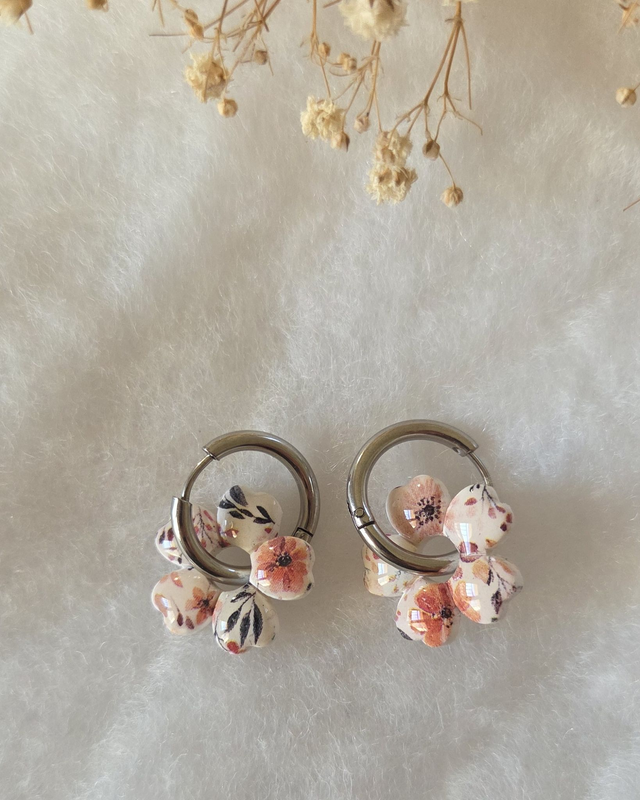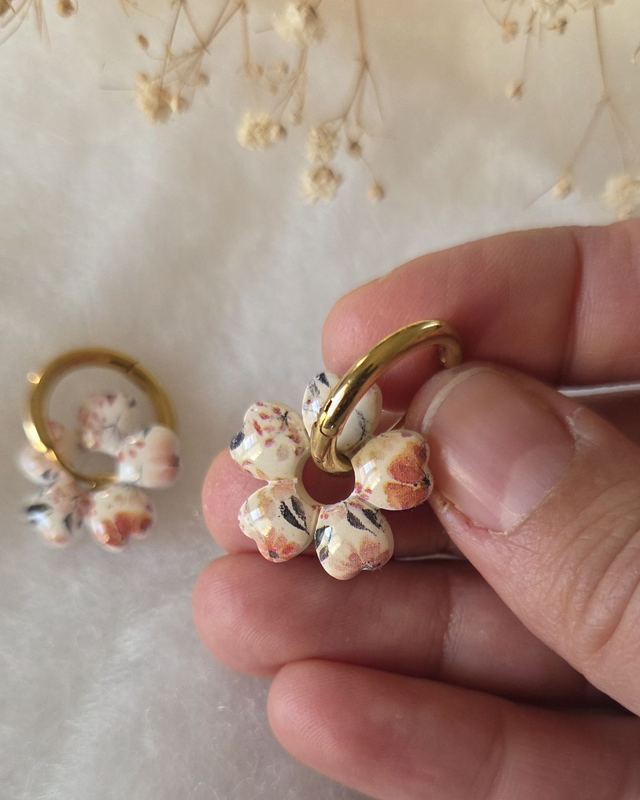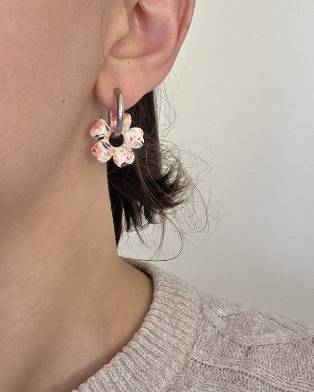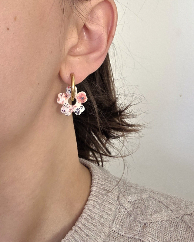 ✨ Issues de la collection Eclats de Noël et inspirées de l'univers du film The Holiday, les boucles d'oreilles modèle FLEUR se composent d'une paire de créoles dorées ou argentées (au choix) en acier inoxydable et d'une pampille en argile polymère.
